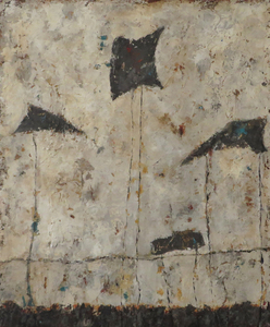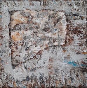 2017Een abstract werk in aardetinten met verweerde uitstraling. Het schilderij is ingelijst in een blankhouten baklijst.
