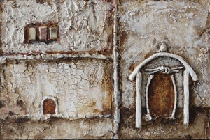 2023Een schilderij in acylverf opgebouwd uit verschillende elementen zoals karton, wol en kersenpitten. Wordt in een blankhouten baklijst aangeboden.