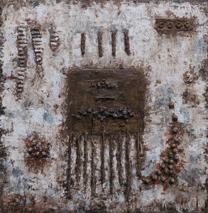 Een abstract werk in aardetinten met verweerde uitstraling.